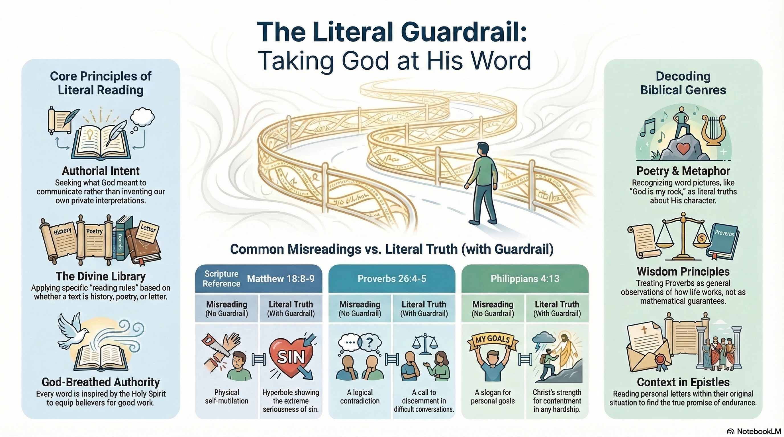 The Literal Guardrail means we take the Bible's words at face value to find the author's intended meaning, even when figurative language is used. Taking God at His Word is an act of trust and honesty. It means we stop trying to make the Bible say what we want it to say and instead humbly ask what He meant to communicate.