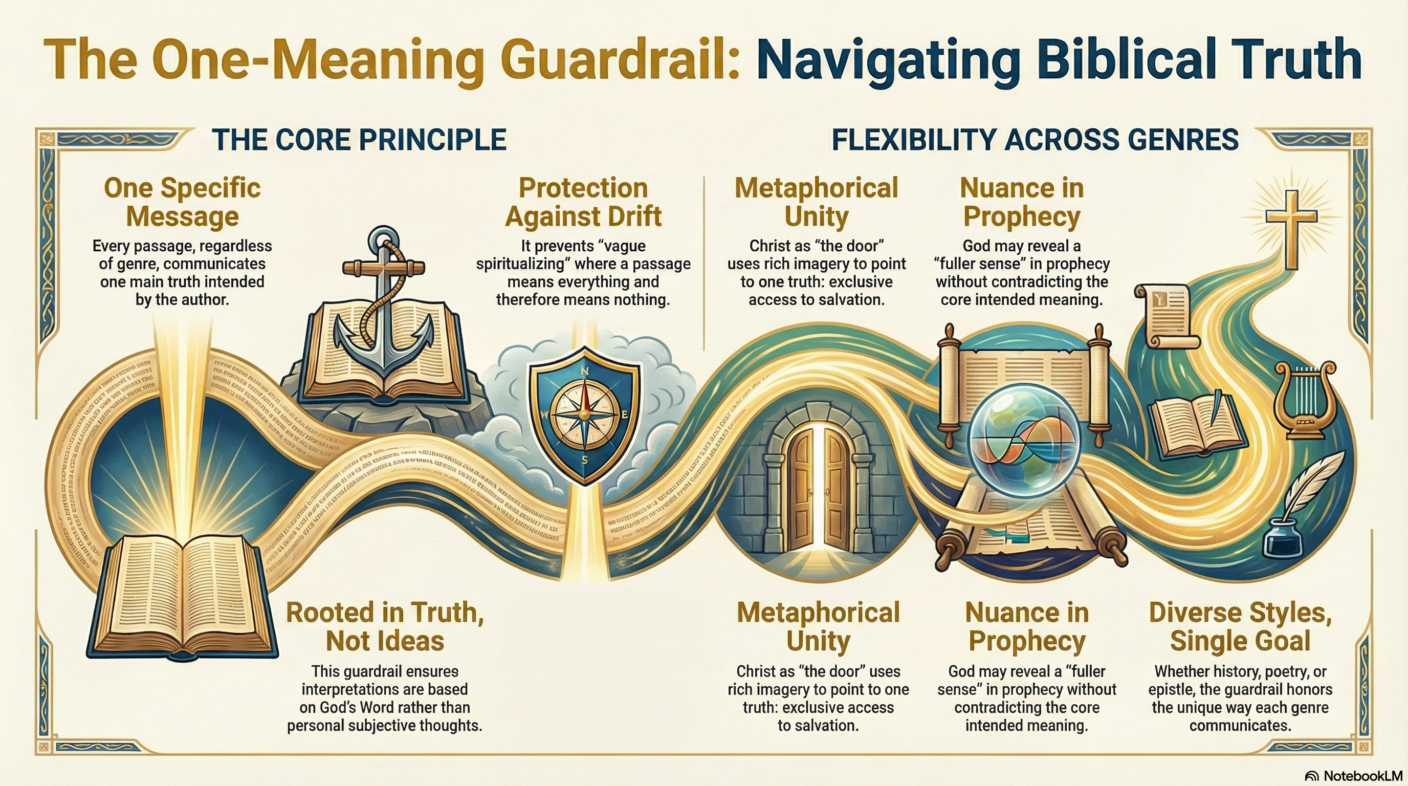 Figurative language is not a loophole. A metaphor with rich imagery still points to one truth. The One-Meaning Guardrail is flexible enough to honor every genre of Scripture, and firm enough to keep every genre from drifting into whatever-you-want-it-to-mean.