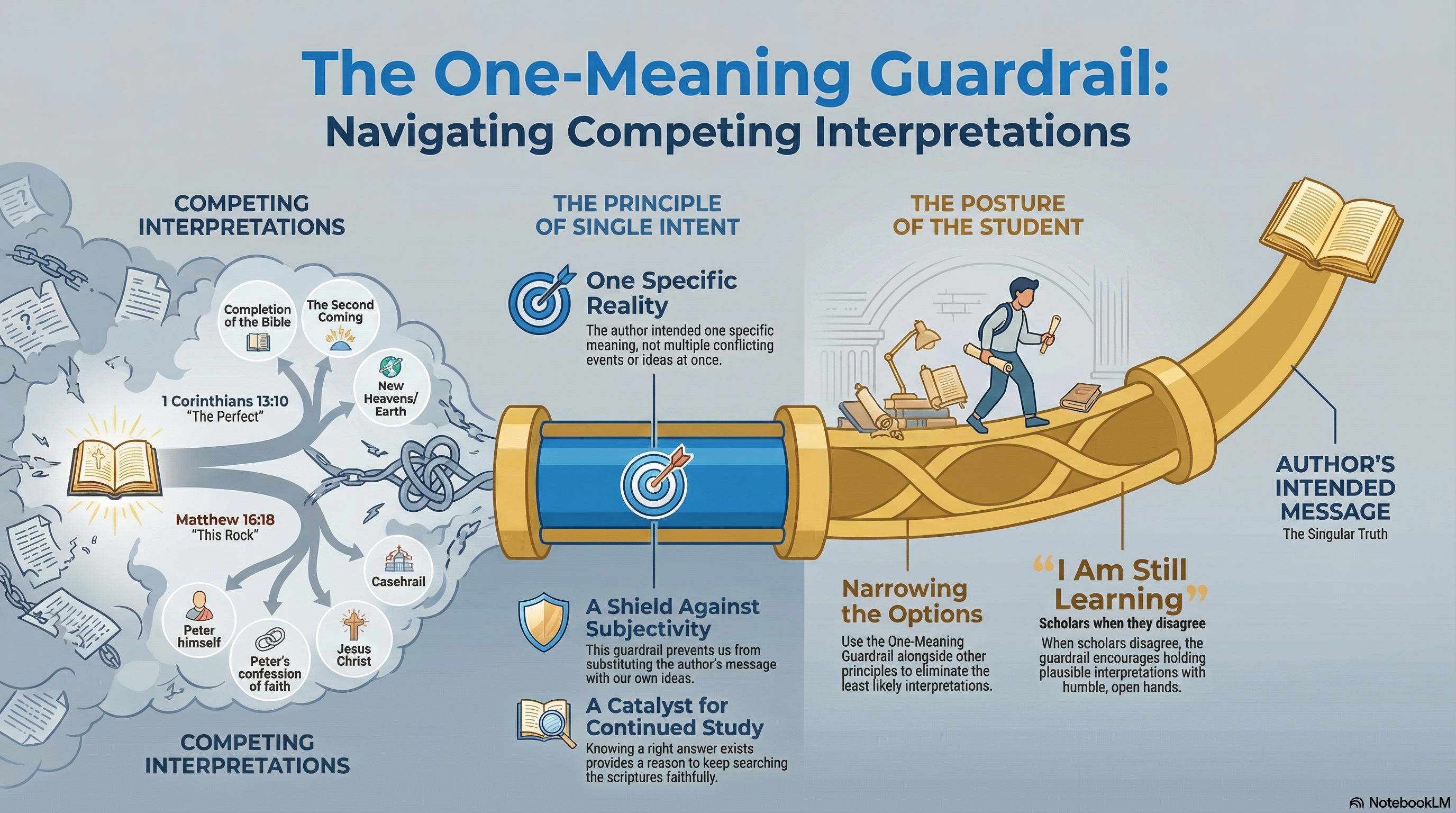 The One-Meaning Guardrail holds that a passage of Scripture has one main, correct meaning: the meaning intended by the original human author under the inspiration of the Holy Spirit. It does not mean that God's Word is rigid or cold. It means that God communicates with purpose and precision, and that His message can be known.