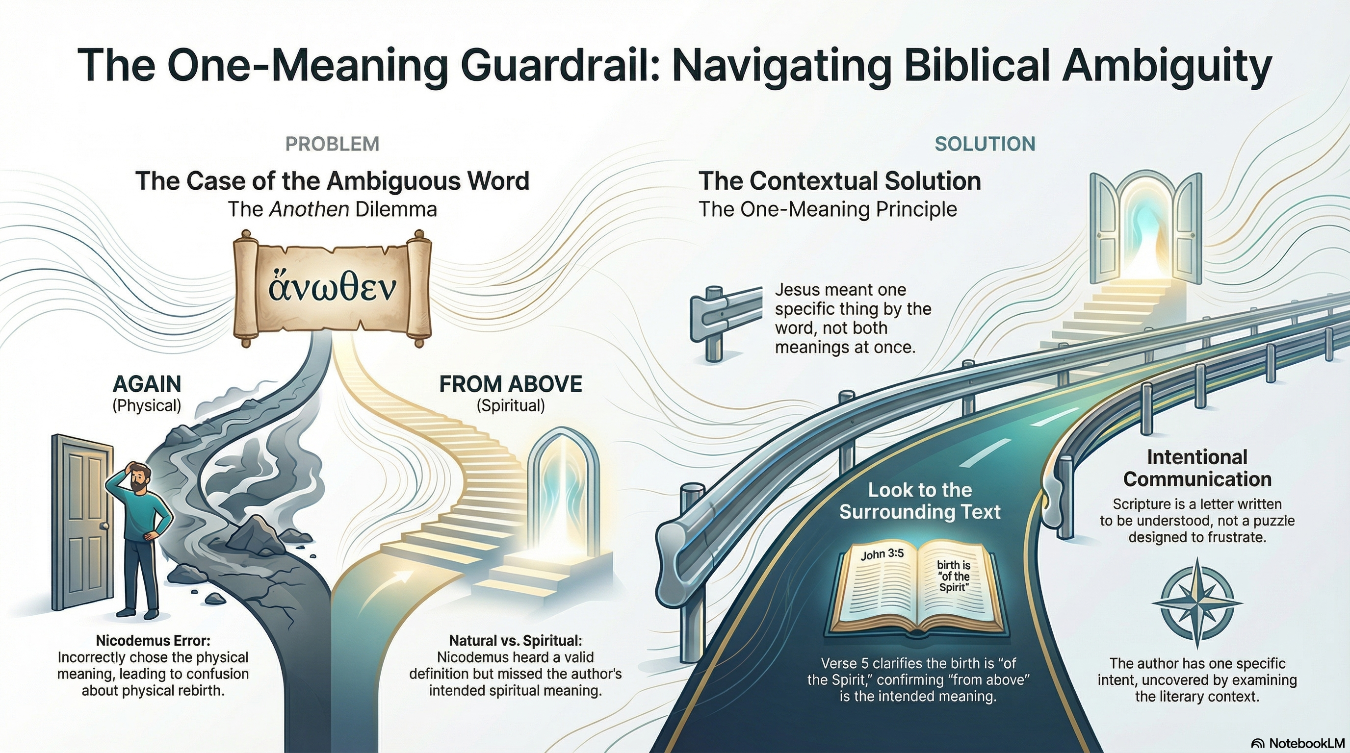 The One-Meaning Guardrail helps us here. It tells us: Jesus meant one thing by this word, not both at the same time. Which one? Context tells us. Jesus goes on to explain that this birth is "of the Spirit" (verses 5–8). The guardrail narrows us to the author's intended meaning even when the original word is ambiguous. Nicodemus got it wrong because he grabbed the wrong meaning. The contextual guardrail steers us to the right one.