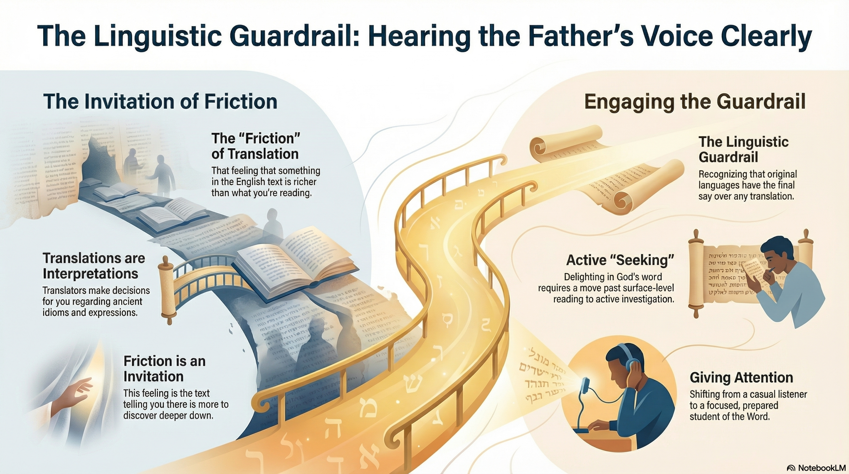 The Linguistic Guardrail began as a technical principle and has arrived at a deeply personal one. The Father is not hiding His heart from you. He wants to be known. He wants to reveal Himself to you more than you want to know Him. He breathed out His Word in specific languages with specific words, and every one of those choices matters. When you use the tools this guardrail provides, you are not performing scholarship. You are pursuing intimacy with the One who chose those words with care.