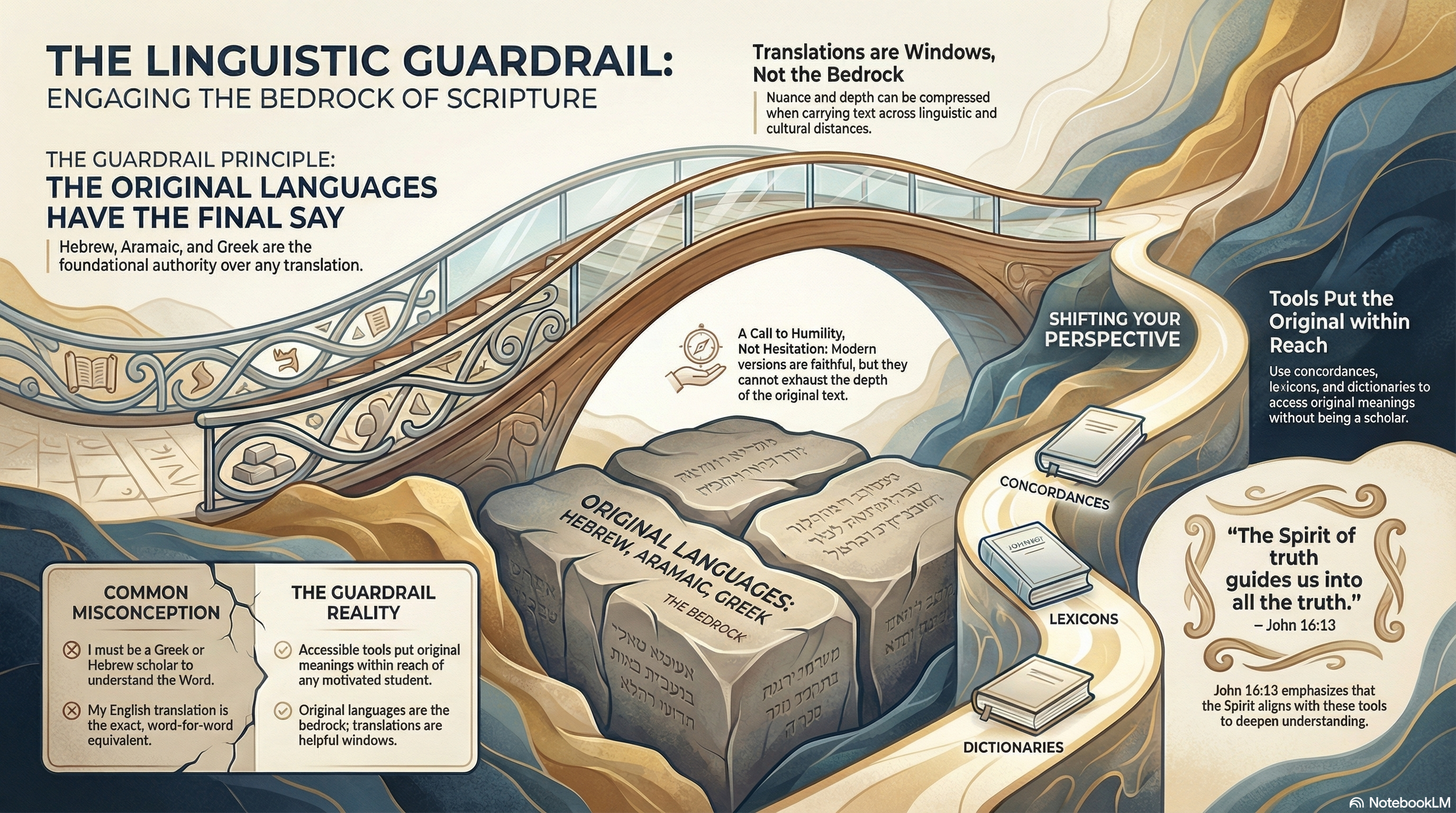 The Linguistic Guardrail holds one foundational conviction: the original languages of the Bible, Hebrew, Aramaic, and Greek, have the final say over any translation. While our modern English versions are faithful and reliable, they are still a translator's careful attempt to carry the original text across a significant linguistic and cultural distance. In that journey, nuance can be compressed, idioms can be flattened, and depth can be simplified.