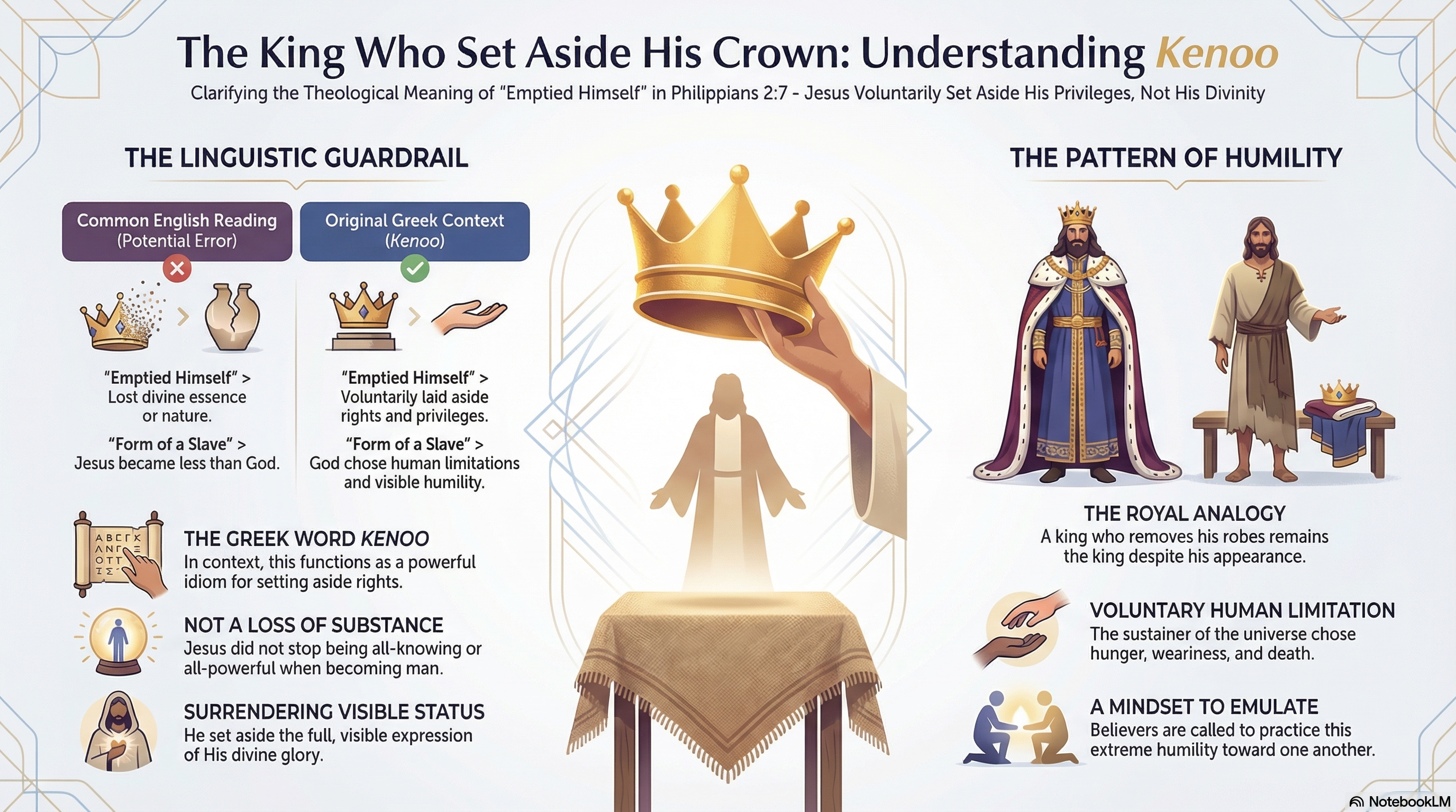 Consider an analogy: a king who, in a profound act of humility, removes his crown and robes, dresses as a common laborer, and goes to live among his people. He has not stopped being the king. His royal nature has not been extracted from him. But he has voluntarily and deliberately laid aside his privileges, his status, and the visible exercise of his royal rights. That is kenoo.