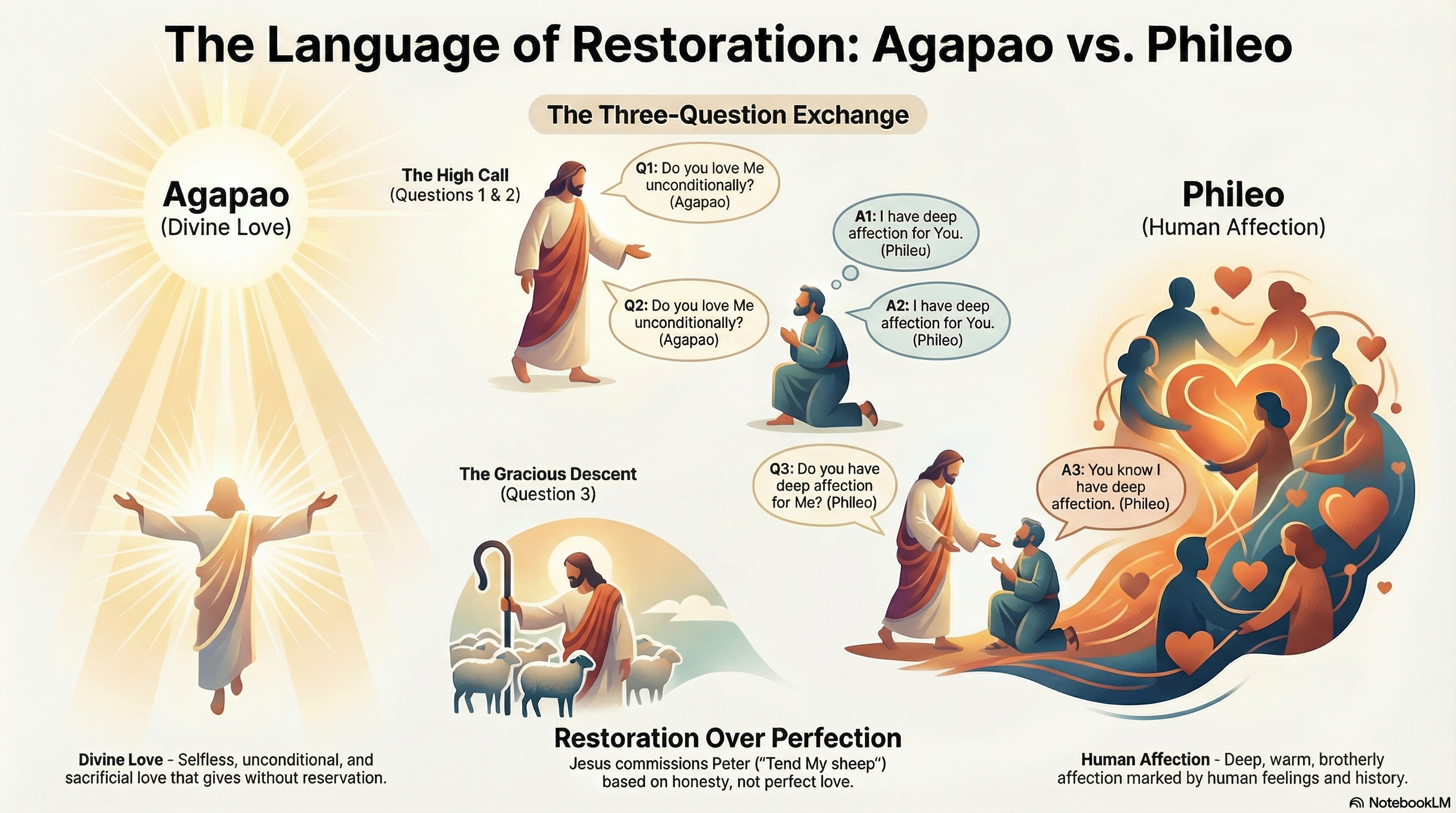 Peter could not claim agapao. Jesus did not demand it. He met Peter in his honest phileo and commissioned him anyway. The Linguistic Guardrail reveals a grace the English alone cannot carry: Jesus restores us not when our love is perfect, but when it is honest.