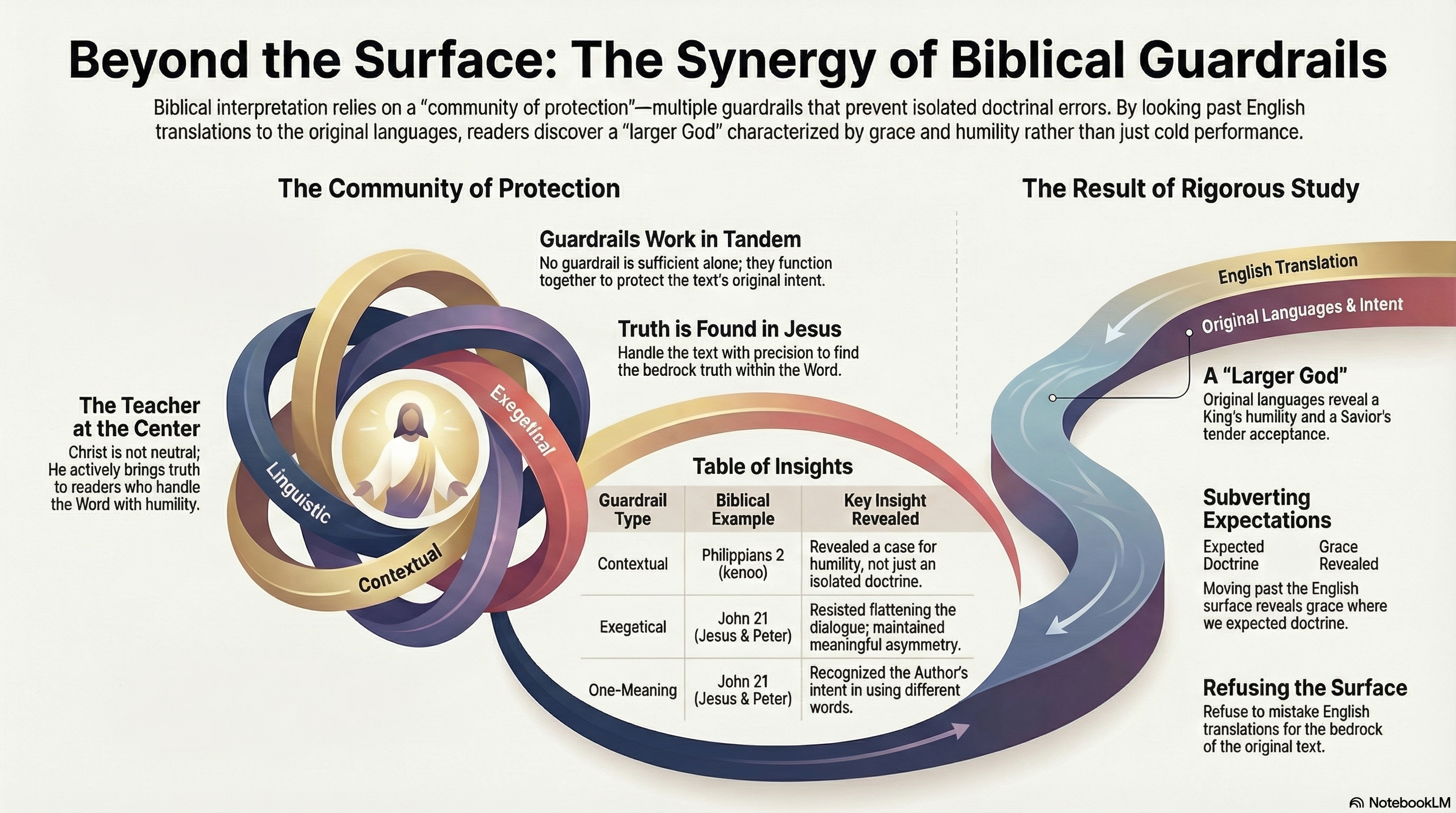 • The Linguistic Guardrail revealed that kenoo means to set aside rights, not to lose one's nature. The Contextual Guardrail showed that Philippians 2 is a call to humility built on the example of Christ. The Exegetical Guardrail kept us from flattening the John 21 exchange into simple repetition. How does the use of multiple guardrails together serve the goal Paul describes in Ephesians 4:21: receiving the truth that is already in Jesus, on His terms?