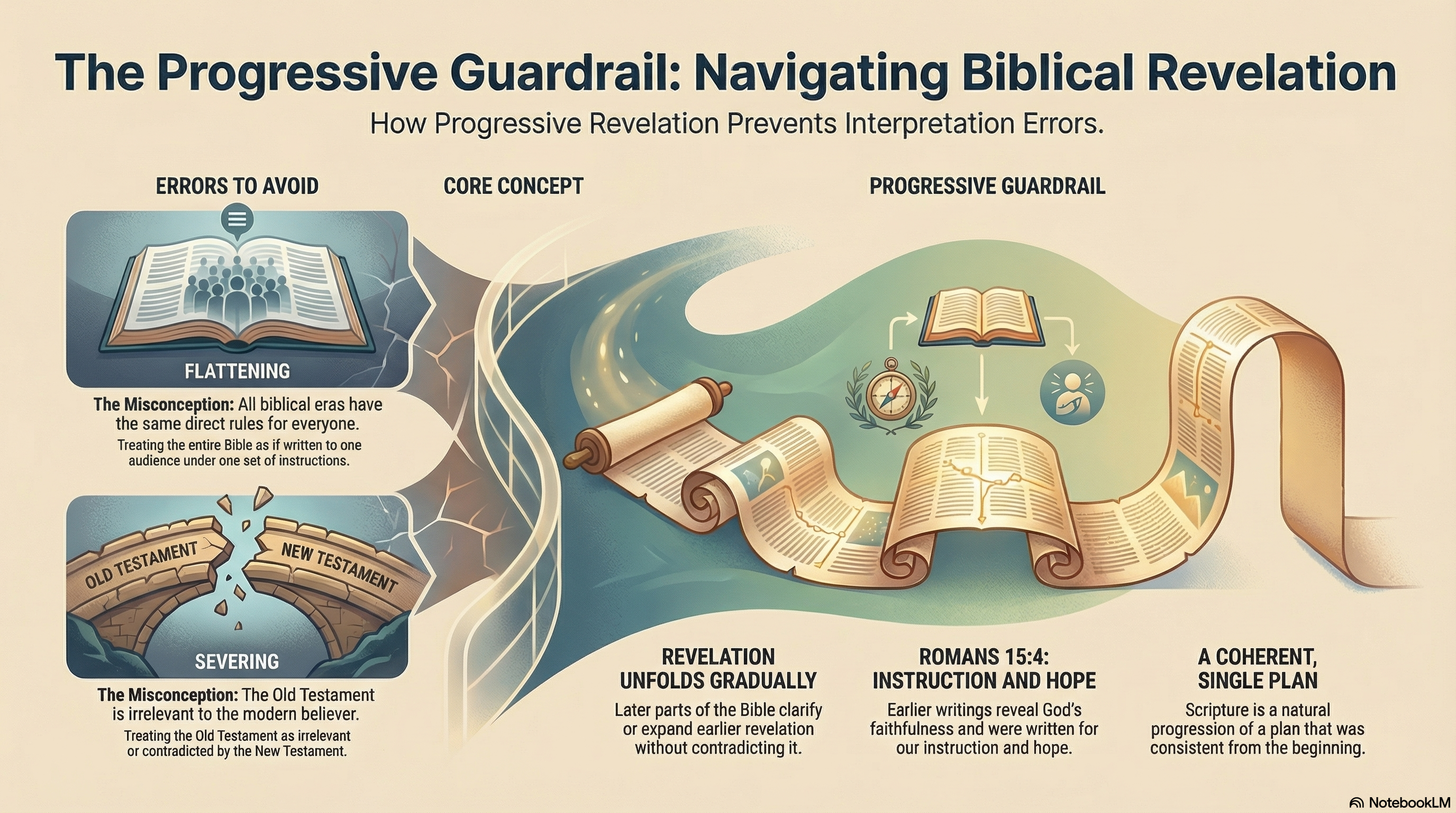 The Progressive Guardrail holds that God's revelation unfolds gradually across time, and that later parts of the Bible can clarify, expand, or supersede what came earlier, without contradicting it. The unfolding of Scripture is not a series of corrections. It is the natural progression of a plan that was coherent from the beginning.