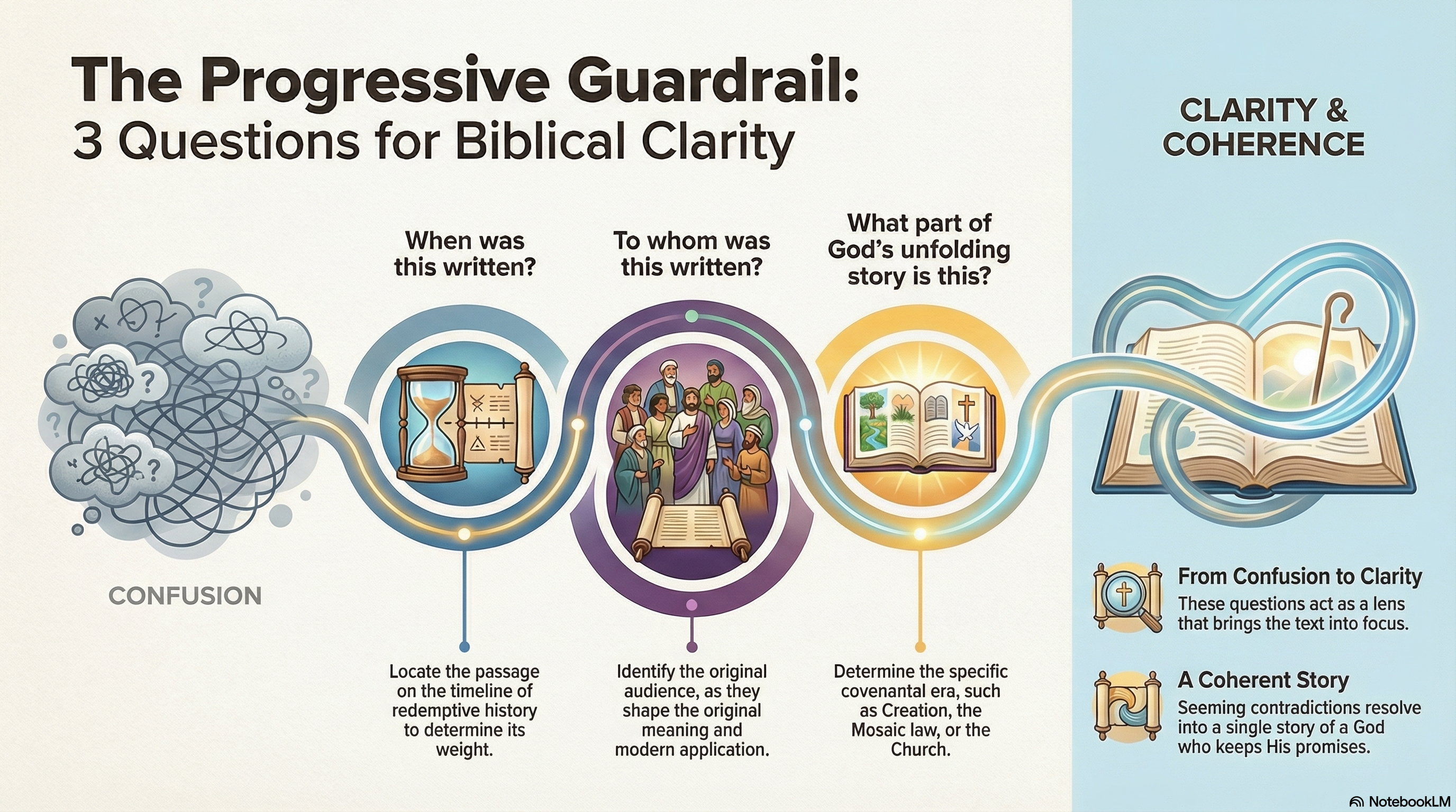The Progressive Guardrail is not abstract theology. It is three practical questions asked before every interpretation: When was this written? To whom? What part of the story is this? These questions are the difference between confusion and clarity when reading across the whole Bible.
