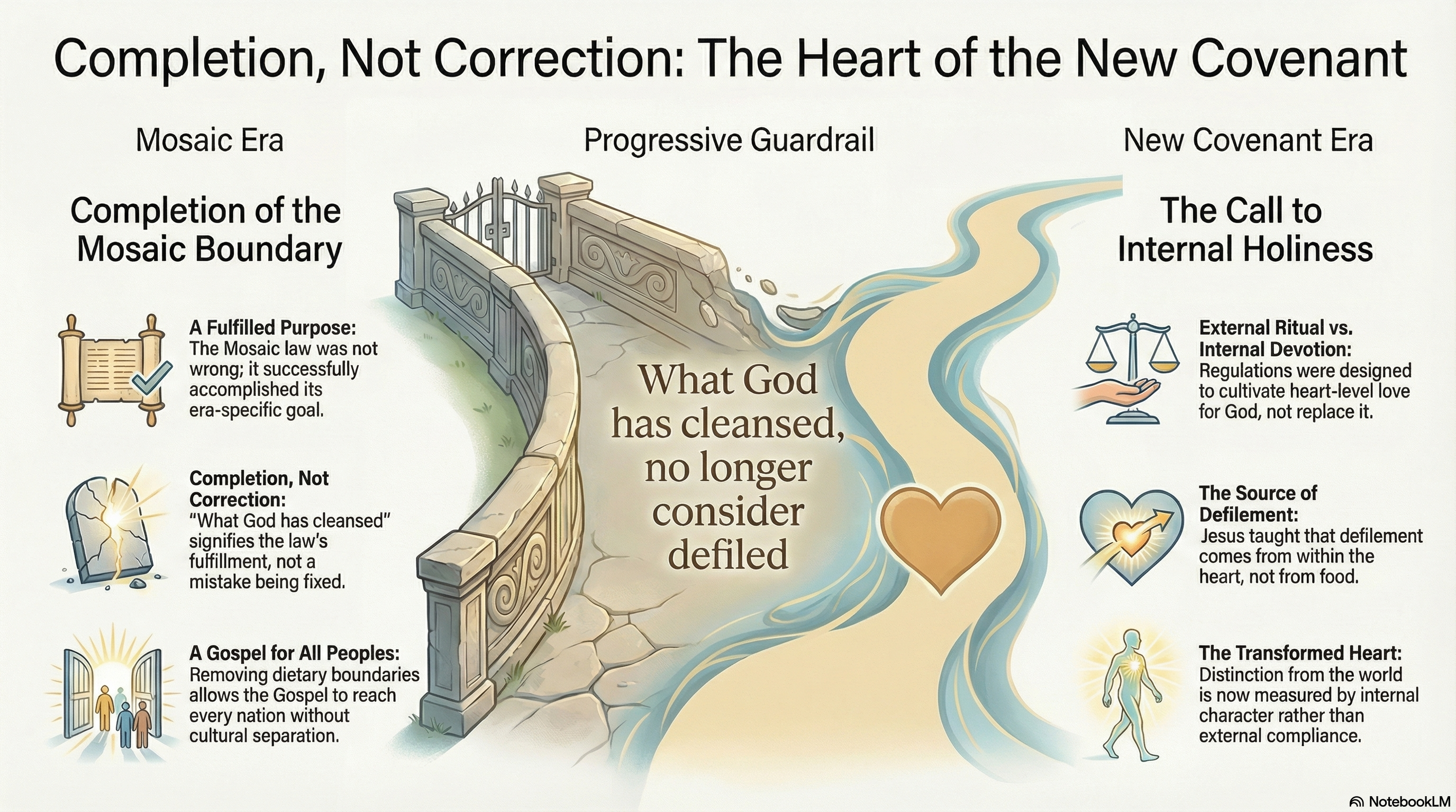 "What God has cleansed, no longer consider defiled." This is the Progressive Guardrail at its most explicit. The Mosaic dietary restrictions were not a mistake. They were not a lesser revelation. They were faithful instruction for their era. And now, in the era of the New Covenant, with the Gospel going to every people and nation, the specific covenantal boundary markers that separated Israel from the nations have served their purpose. A Christian can eat a meal with anyone from any culture. The wall of separation has come down, because the fulfillment that wall was protecting has arrived.