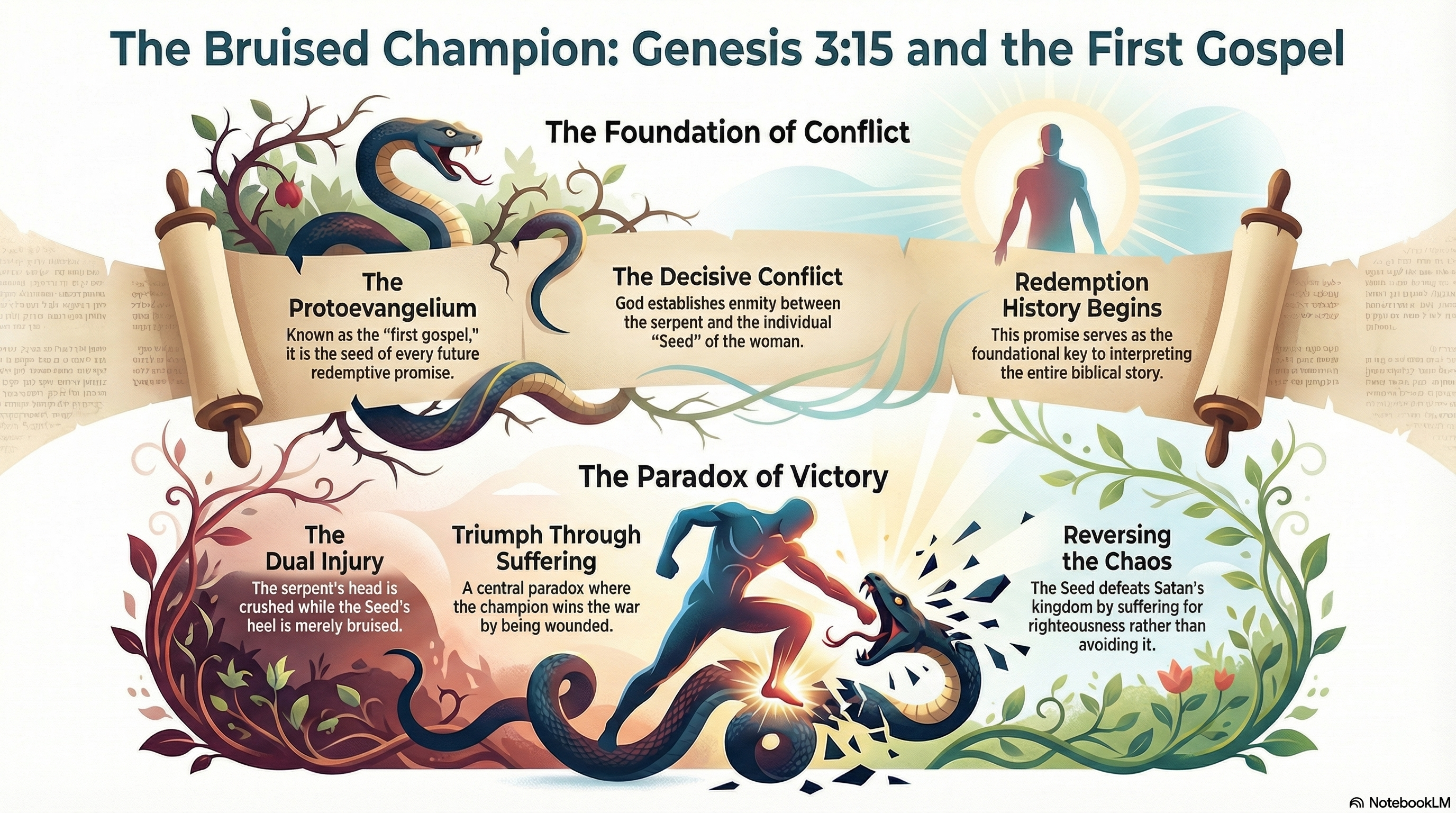 This is the bruised champion motif. And God places it at the very opening of redemption history, not as a footnote, but as the foundational key to interpreting everything that comes after. Salvation history tells the story of this elect Seed reversing the chaos that entered the garden, not by avoiding suffering, but by suffering for righteousness in the war against Satan's kingdom.