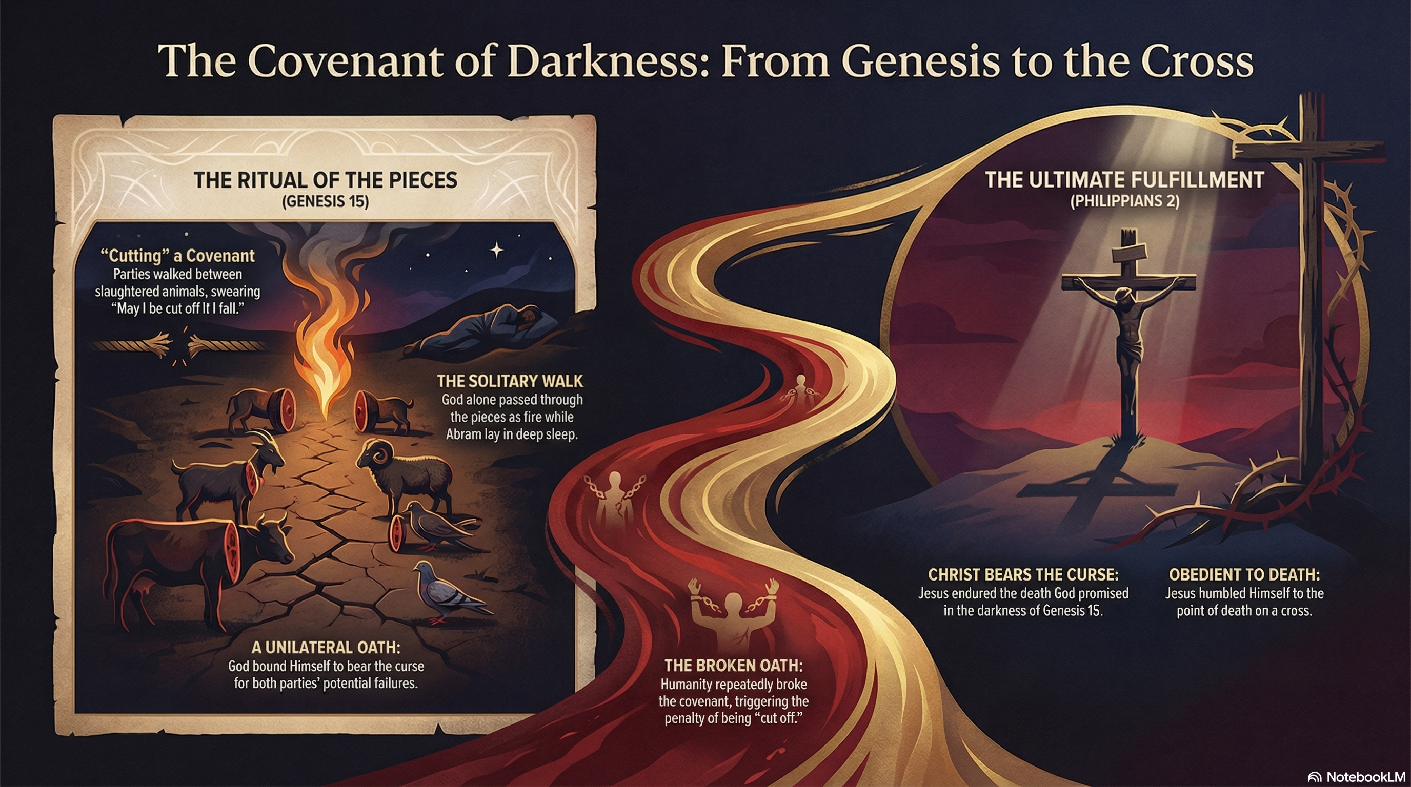 Jesus was cut off for our transgressions. He bore the full weight of the covenant curse that God had placed upon Himself in the darkness of Genesis 15. The cross was not a surprise. It was the fulfillment of a promise made before Abraham even had a son, a promise God made to a sleeping man in an ancient night, a promise the God who walked alone through those pieces was committed to keeping, at any cost.