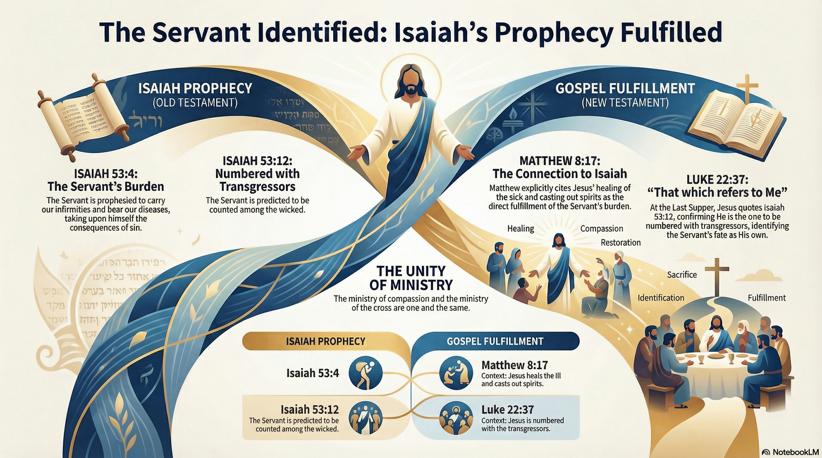 The Gospels do not announce the Servant with a fanfare. He appears, as Isaiah predicted, without stately form or majesty. A carpenter from Galilee. Matthew, writing to a Jewish audience who knew their Scriptures, pauses during the healing ministry to make the connection explicit: