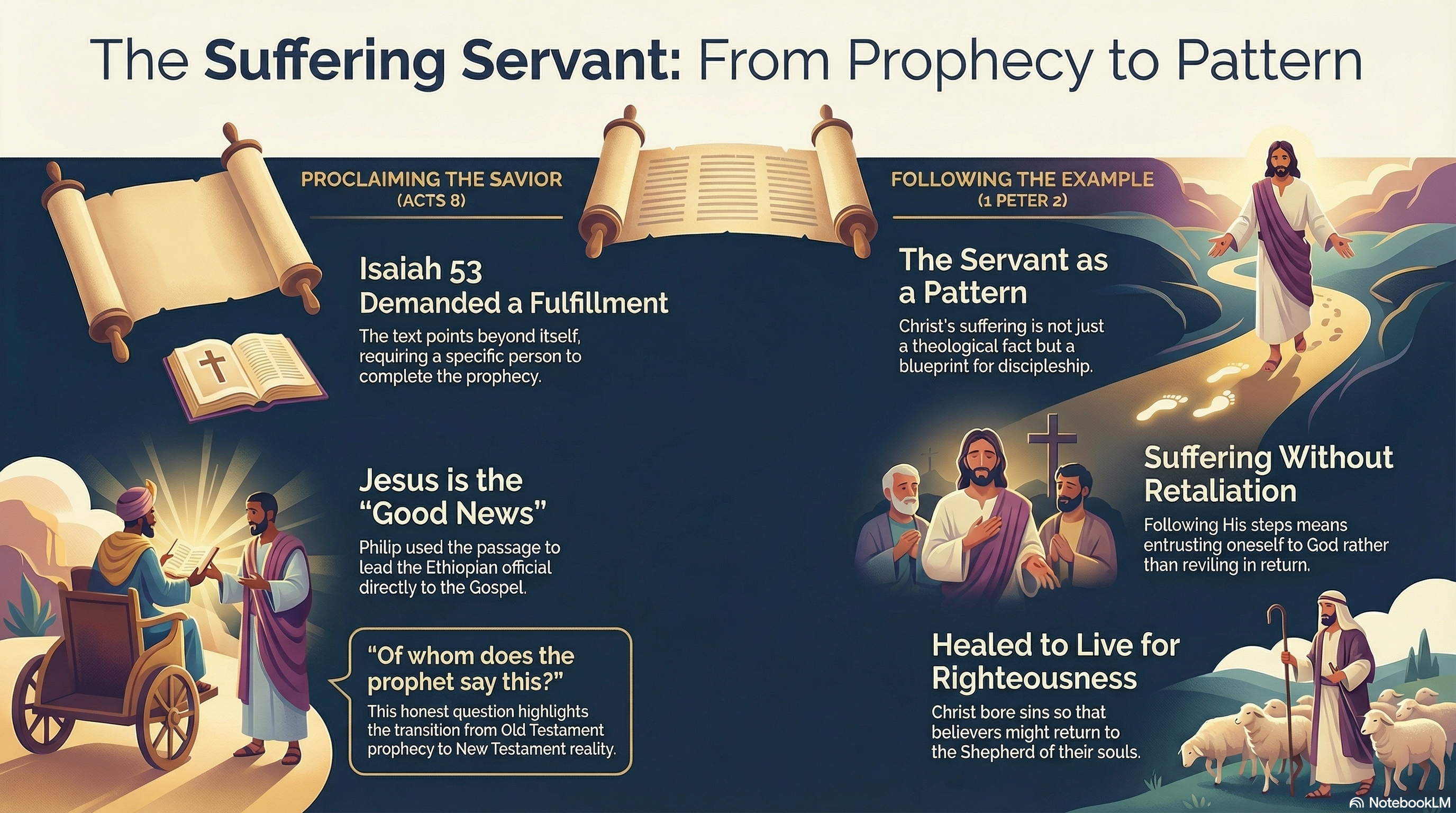 1 Peter 2:21–25 brings the motif to its most personal and challenging application. Peter quotes Isaiah 53 not merely as a description of what Christ did, but as the pattern for how disciples are to live. This is the turn that transforms the lesson from theological instruction into a personal call: